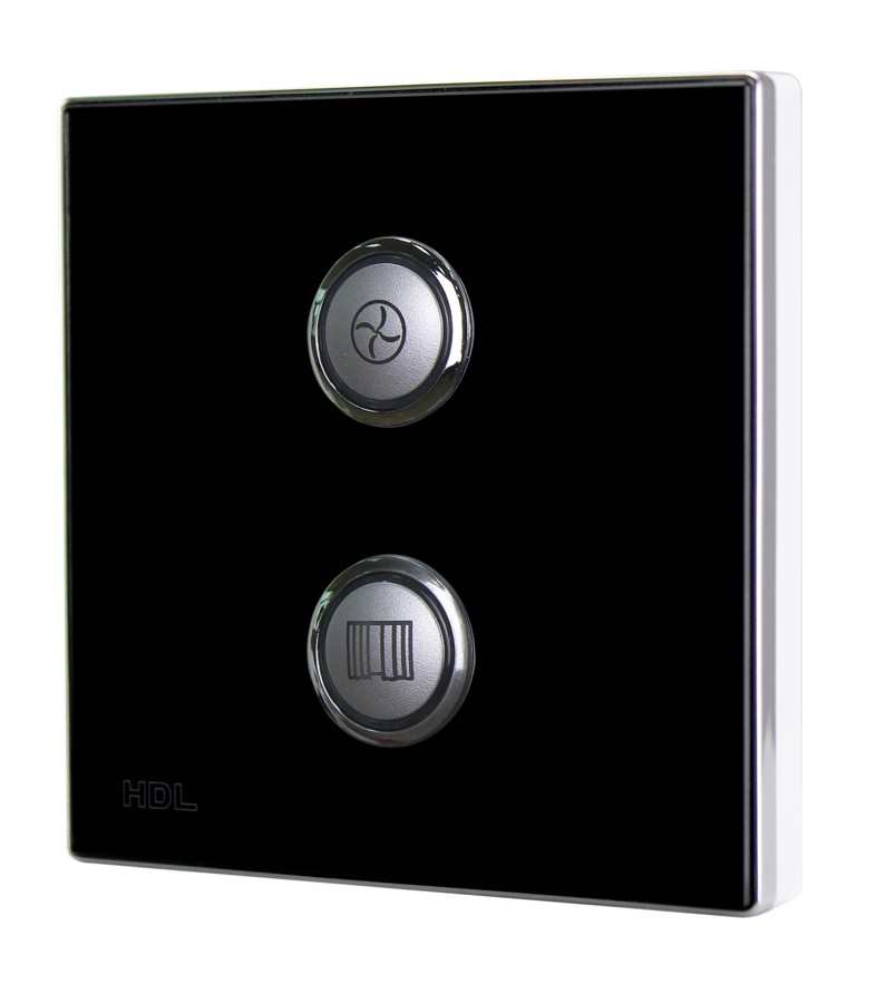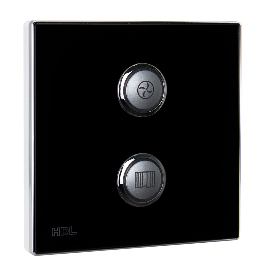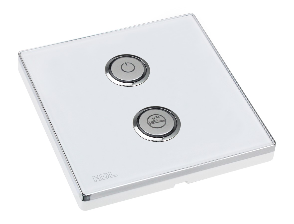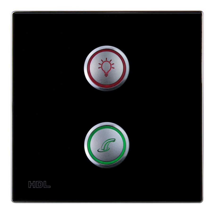 Bezdrátový ovládací panel řady iSense, 2 tlačítka,  barevně nastavitelné LED podsvícení, spínání a stmívání světel, ovládání závěsů, řízení scén a sekvencí, vyměnitelné čelo panelu,  gravírování symbolů za příplatek, vyžaduje některý z akčních členů, např. HDL-MPWPID00LN.18