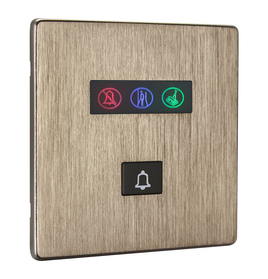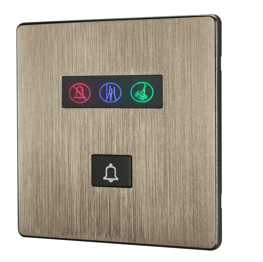 Zvonkové tlačítko hotelového systému řady iElegance 3S, připojení na sběrnici Buspro, povrch z kartáčovaného bronzu, možnost gravírování nápisů, funkce zvonkového tlačítka a 3 symbolů s nastavitelným podsvícením Nerušit/Úklid/Prádlo.