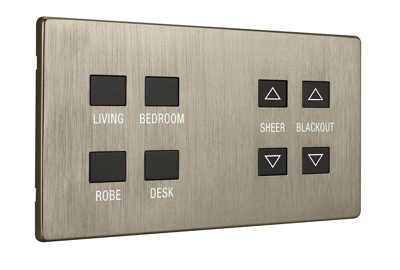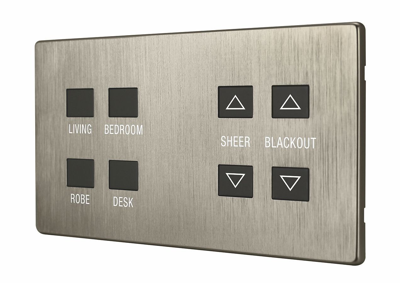 Ovládací panel řady iElegance 8 tlačítek, připojení na sběrnici Buspro, povrch z kartáčovaného bronzu, možnost gravírování nápisů, rozlišuje krátký a dlouhý stisk a dvouklik.