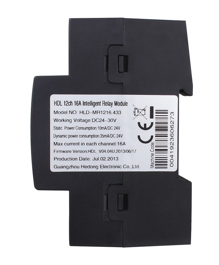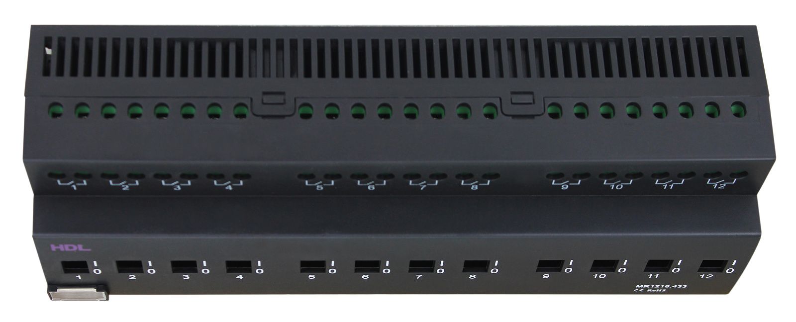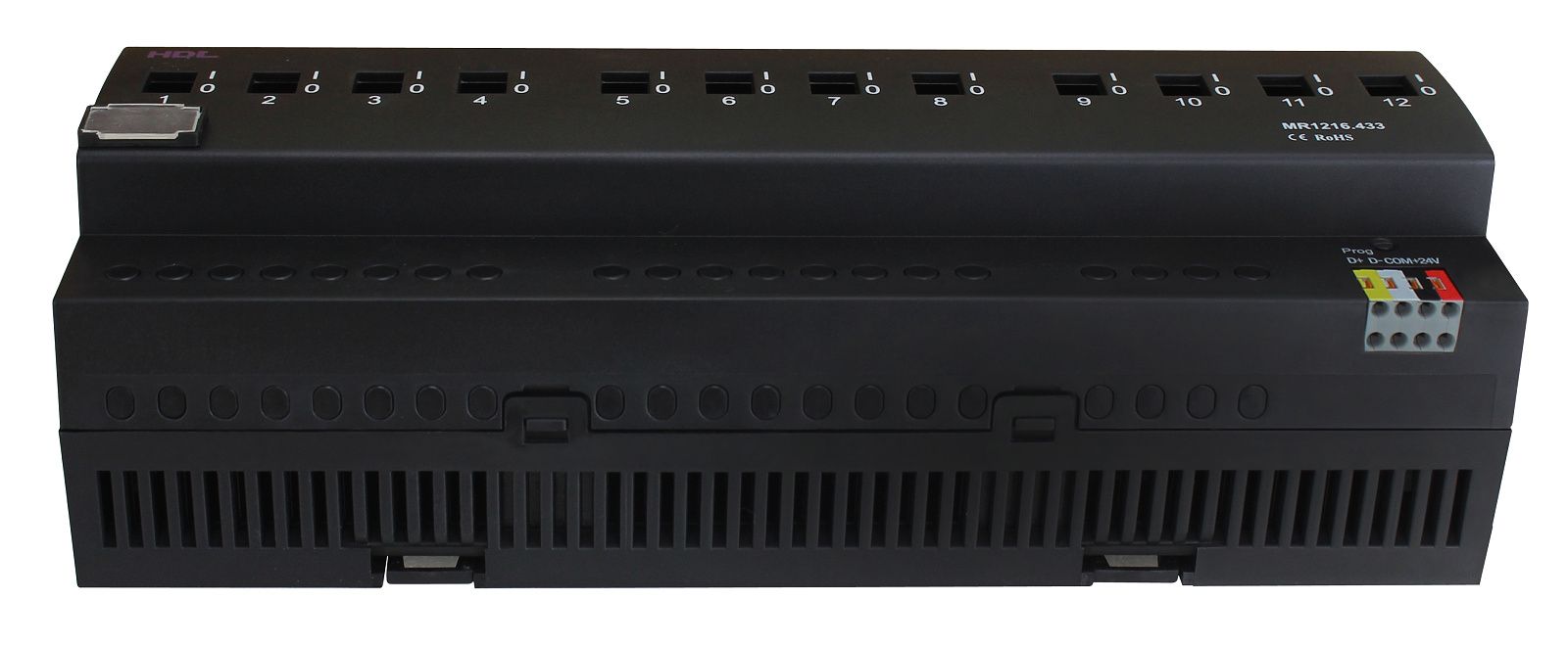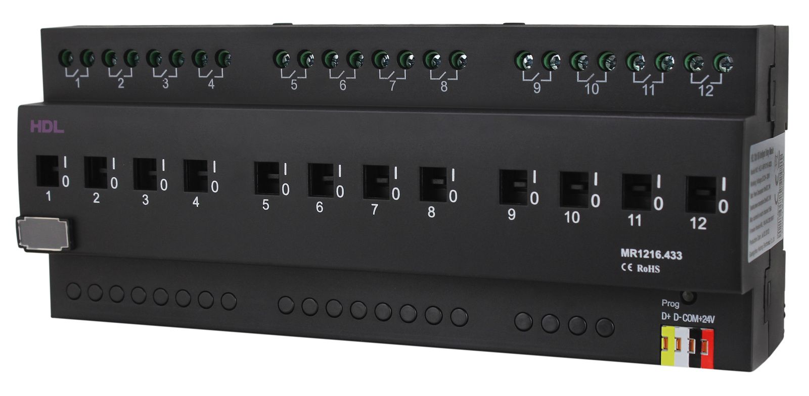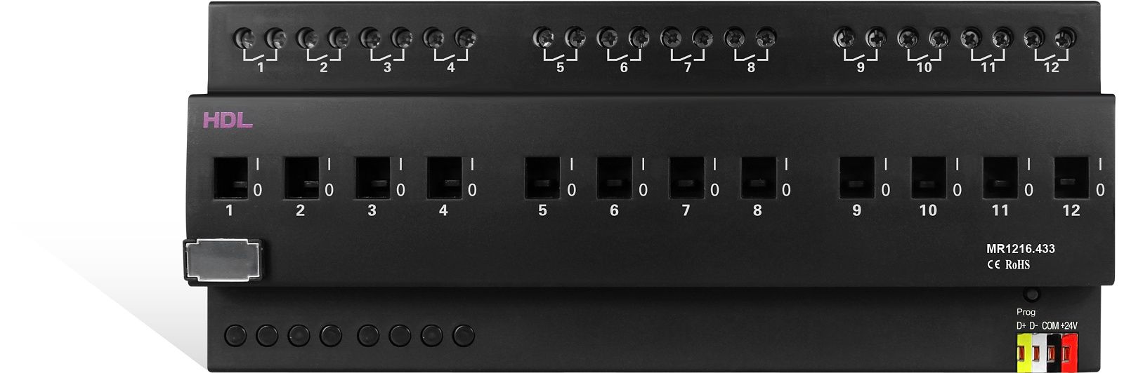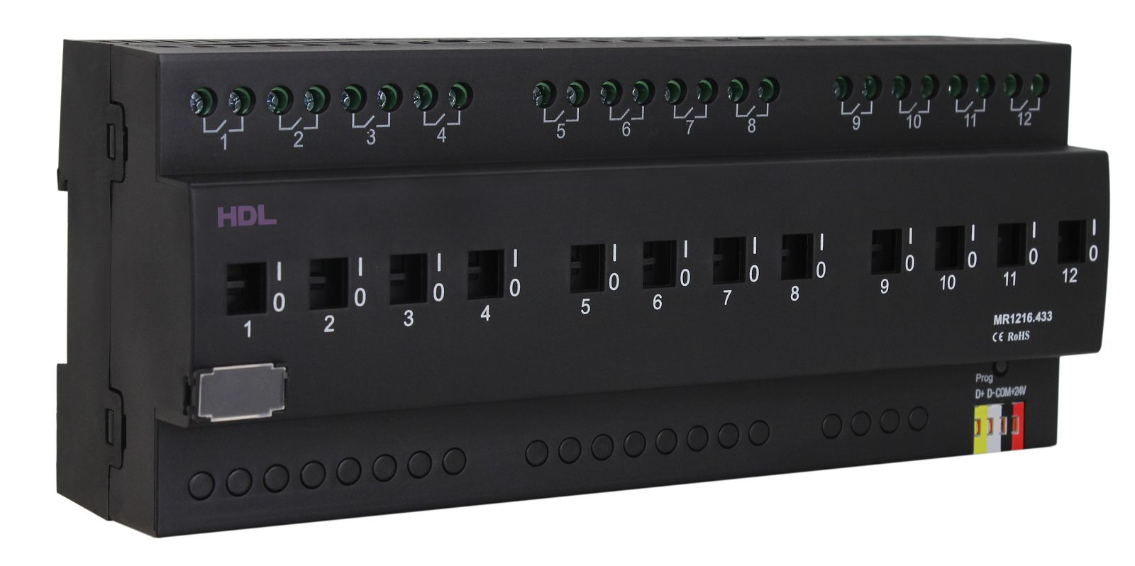 Modul výkonového relé  12 kanálů x 16 A, na DIN lištu, nastavení scén a sekvencí, pro napětí střídavé  jednofázové i třífázové, max. napětí na kontaktech do 440 VAC.