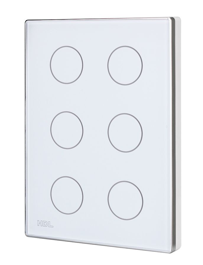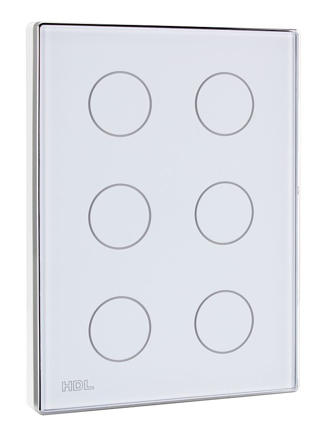 Ovládací panel řady iTouch, 6 tlačítek, barevně nastavitelné LED podsvícení, spínání a stmívání světel, ovládání závěsů, řízení scén a sekvencí, vyměnitelné čelo panelu, čidlo teploty, volitelně IR ovladač, vyžaduje sběrnicovou spojku HDL-MPPI.46.