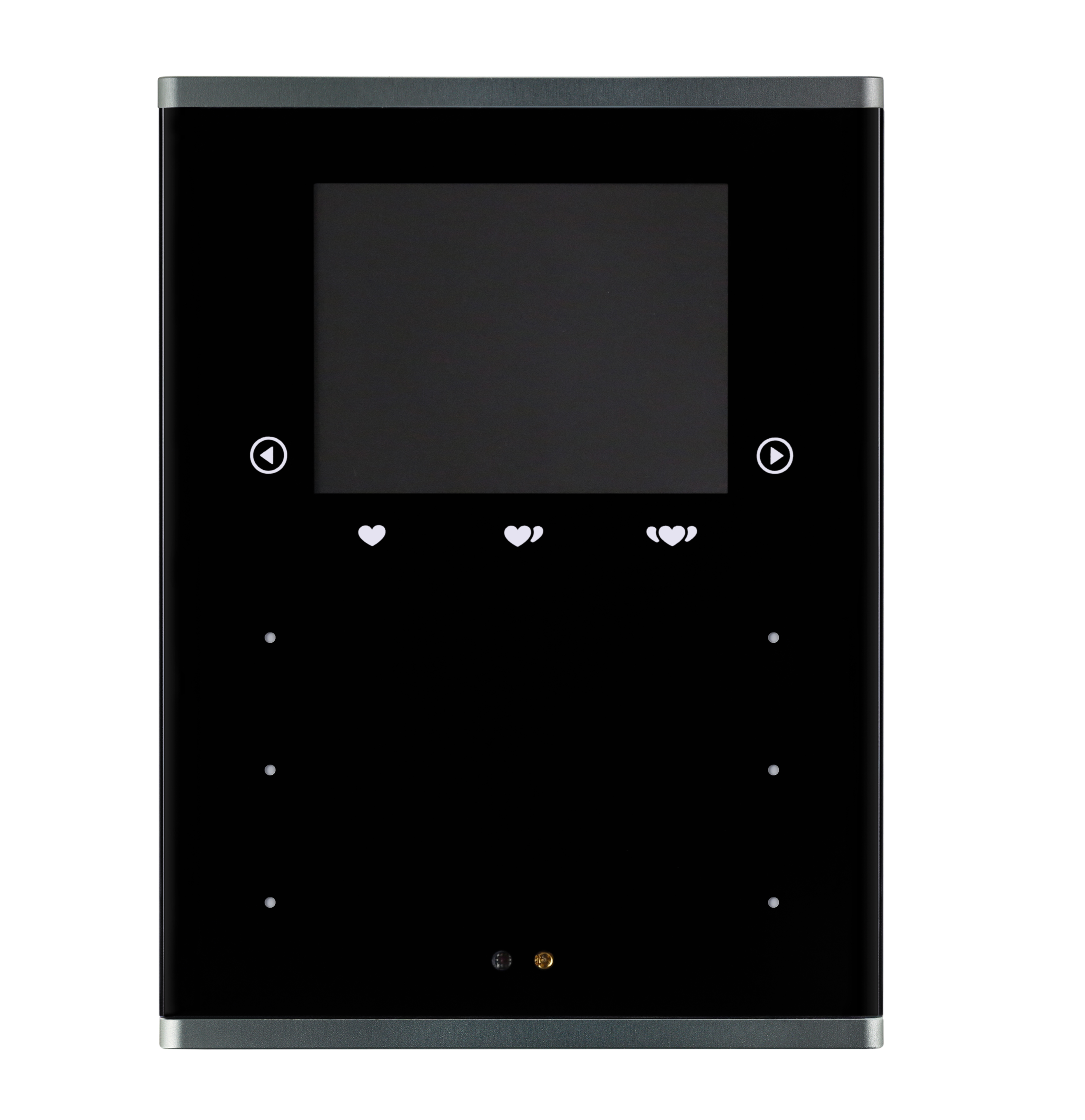 Ovládací panel Prism Pro multifunkční dotykový panel, s dotykovým LCD dipslejem a kovovým rámečkem,  barevně nastavitelné RGB LED podsvícení, spínání a stmívání světel, ovládání závěsů a žaluzií, řízení scén a sekvencí, audia, vytápění a klimatizace, volitelně IR přijímač, teplotní senzor, funkce Wake-up, zpětná hlasová vazba, vyžaduje sběrnicovou spojku HDL-MPPI.46-A.