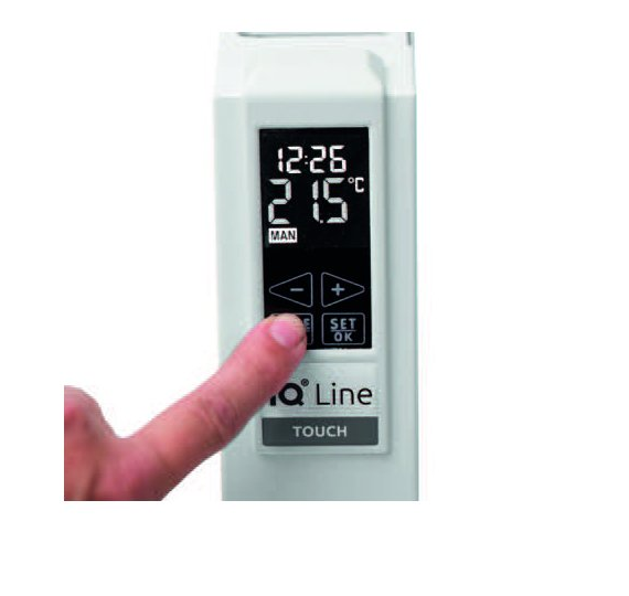 Elektrický olejový deskový radiátor 1000 W, IQ Line Touch s akumulací a inteligentní časovou regulací pro úsporu nákladů na vytápění. Design klasického teplovodního radiátoru s hloubkou 70 mm.
