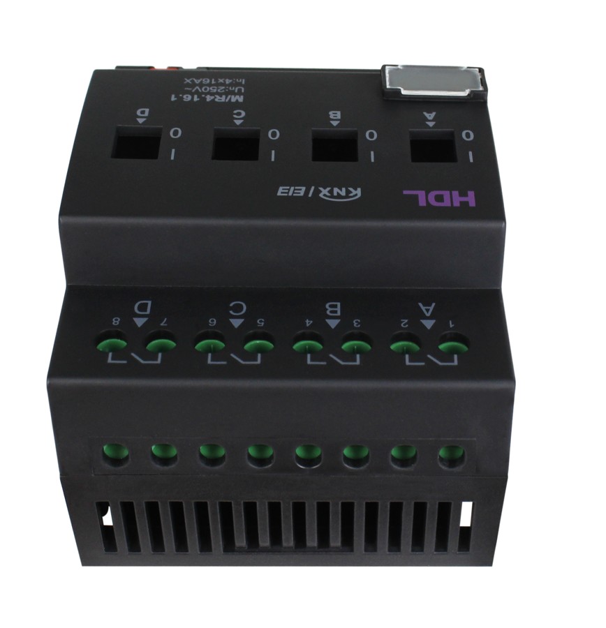 HDL-M/R4.16.1 Akční člen spínací 4násobný, 16 A Řadový, bezpotenciálové kontakty s vysoko proudovými magnetickými relé ke spínání 4 nezávislých zátěží prostřednictvím sběrnice KNX, každý kontakt lze napájet samostatně, každý kanál je opatřen optickým ukazatelem stavu s možností ručního spínání. Parametry Model HDL-M/R4.16.1 SKU 435411 Proud sběrnice 15 mA Šířka 72 mm Výška 90 mm Hloubka 66 mm Váha 257 g Materiál CustomOne CustomTwo CustomThree CustomFour CustomFive Kategorie slevy A 17 ks skladem skladem skladem Zboží můžete nakoupit skrze registrovaného partnera HDL. Dotaz na zboží Dokumenty k produktu Katalogový list M/Rx.16.1_CZ_v1 Product manual M/Rx.16.1 Appl. program information M/Rx.16.1_(V1.0) Application program M/Rx.16.1_(V1.2) PoP_HDL-M-R4-16-1