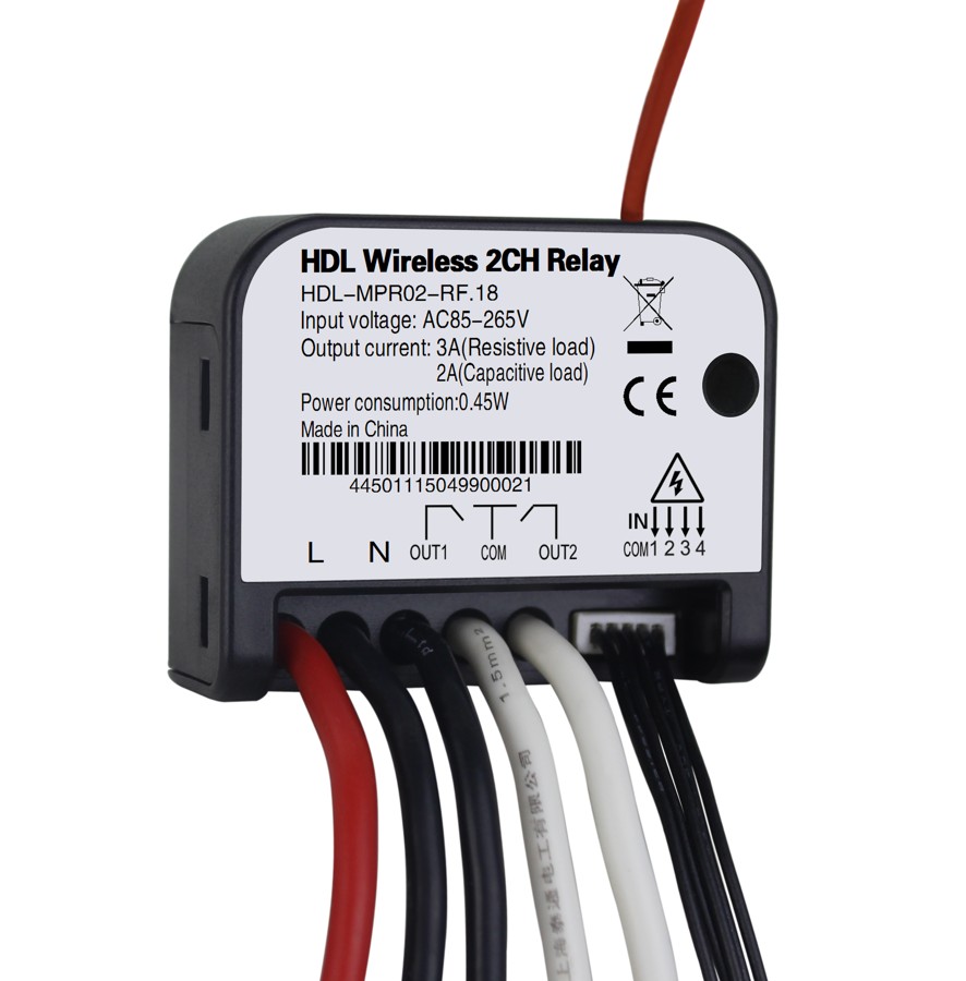 2CH Wireless Relay Actuator (L+N Type), Input voltage: 85-265 VAC, 50/60 Hz, Output current: 8 A, 2CH relay output, Support switch on delay, protection delay, switch off delay, has 4CH dry contact, can control target by switch.